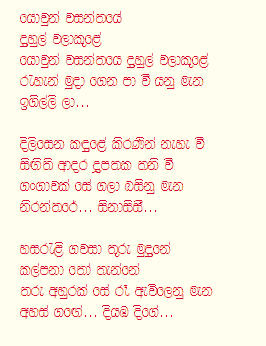 Singing their sweet melodies of love Dancing to that rhythm, in the autumn breeze Blossoming are the tiny buds, hidden inside soft leaves..... Tired of weeping, pausing for a moment Blinded by darkness, and stranded on the way When I was wandering, like a cloud floating You came in the autumn and light up my way..... Feeling lonely, sighing day and night Giving up everything, I ran away from my plight Like a moon emerging through the misty night You came in the autumn, bringing the spring to my life..... |